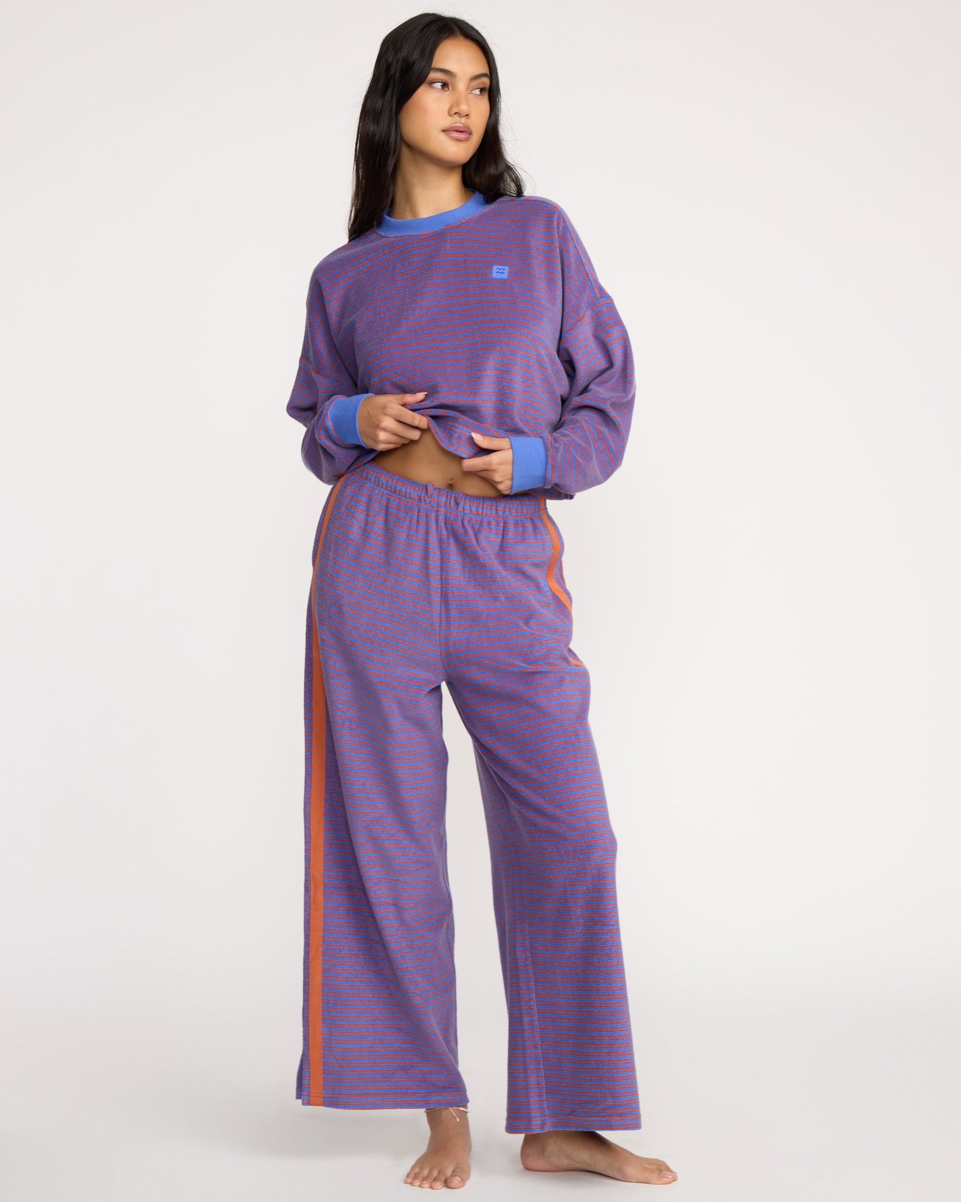 Our cotton-blend terry pants bring easygoing style with a relaxed, wide-leg silhouette. The elastic waist keeps things comfortable, while contrast tape details and handy side pockets add a dash of practical cool. Featured here in the Blue colorway.