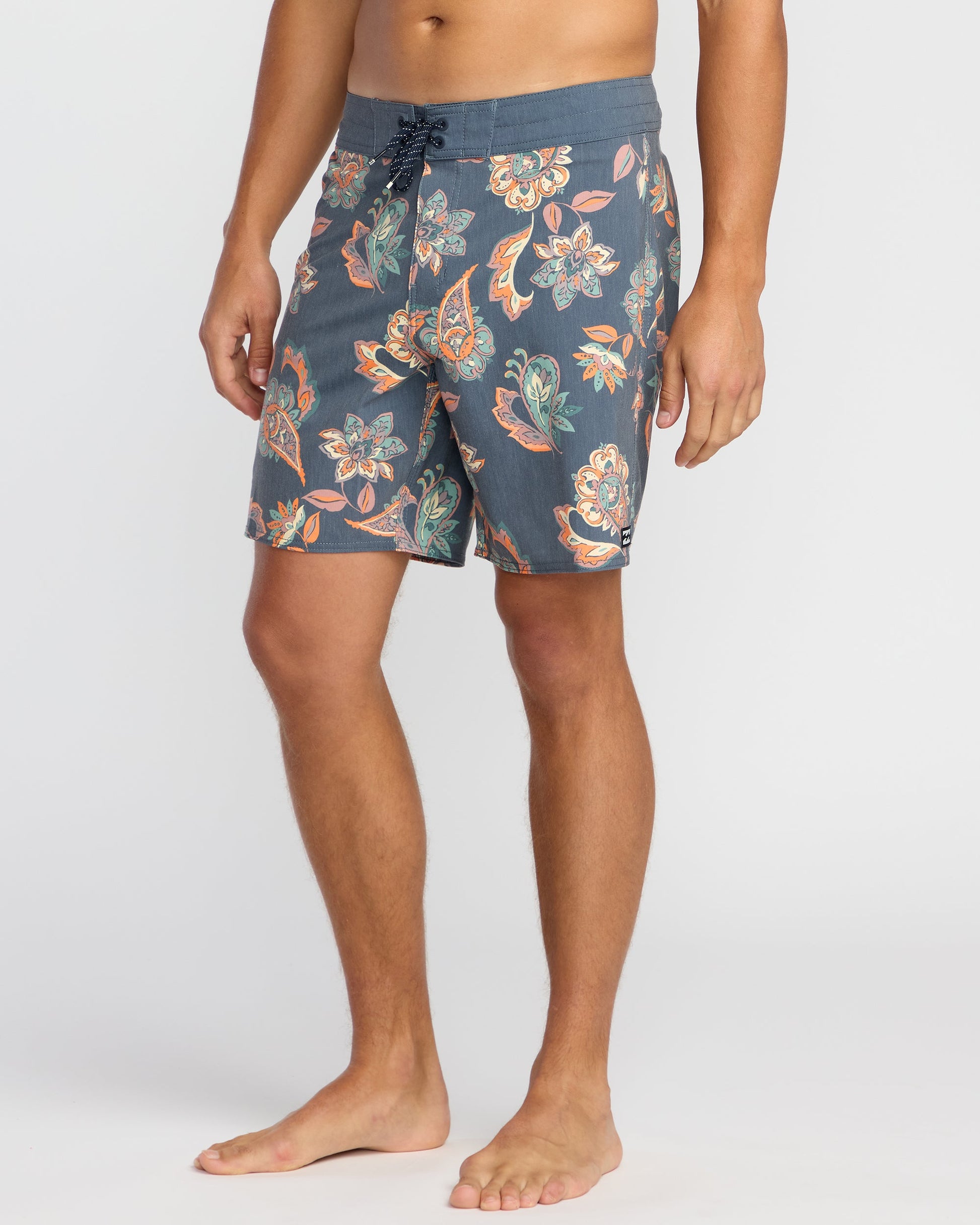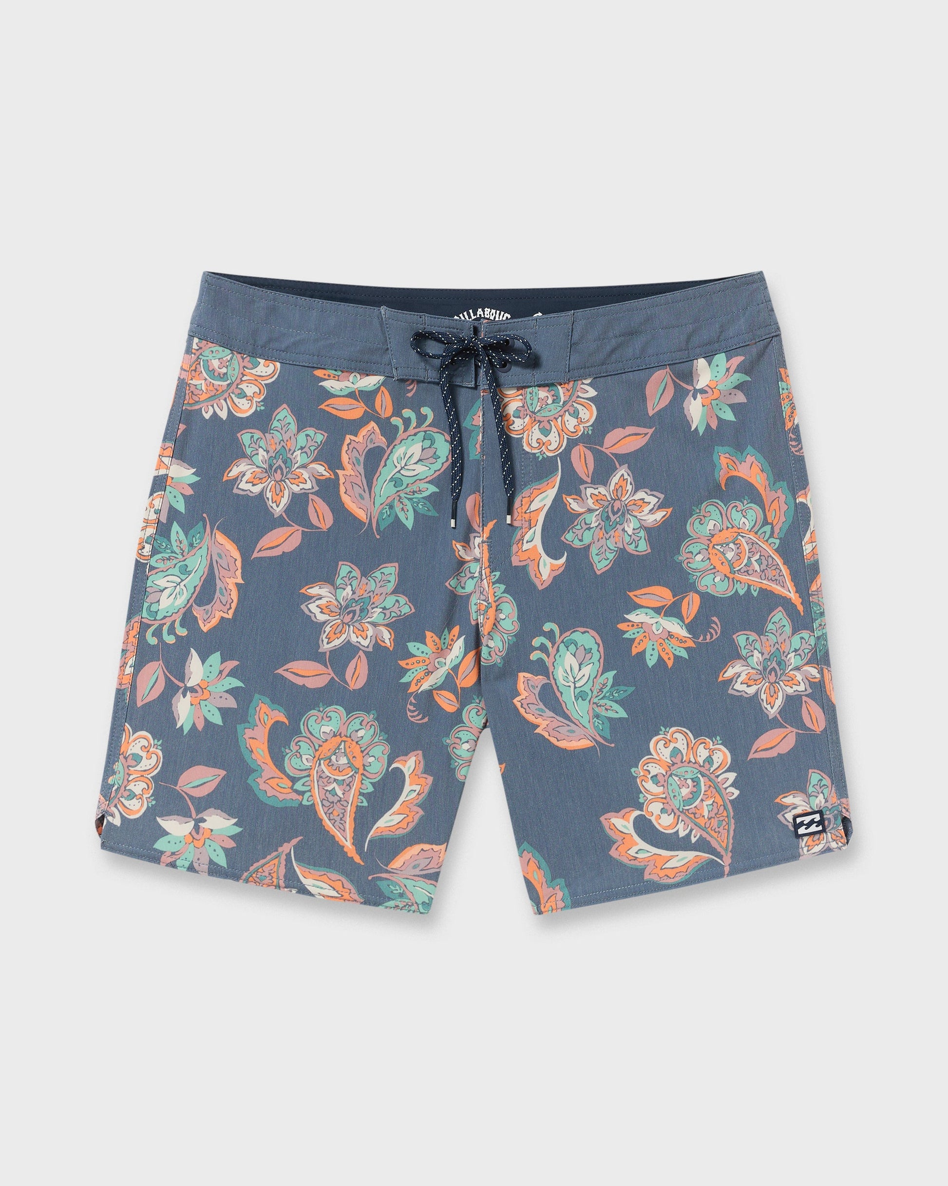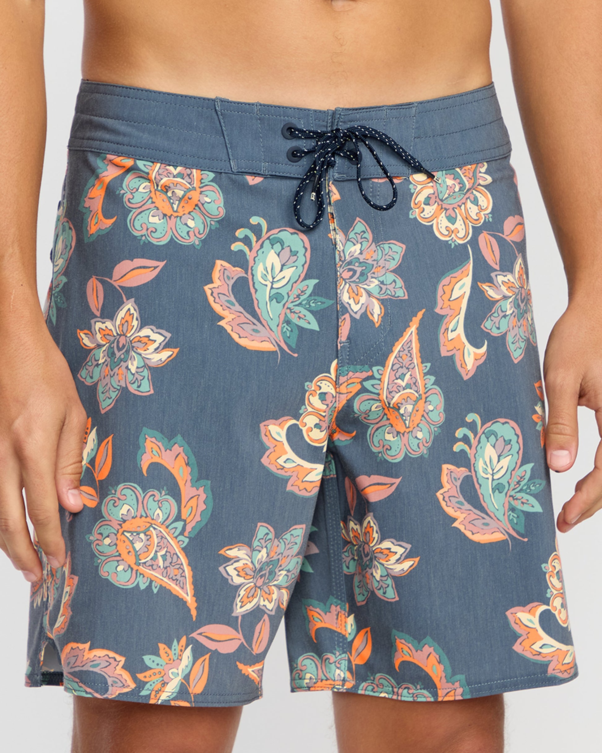 Our Good Times Pro Performance 18" Boardshorts blend poly cotton stretch for mobility, featuring a back pocket and vibrant all-over prints. Featured here in the Midnight Blue colorway.