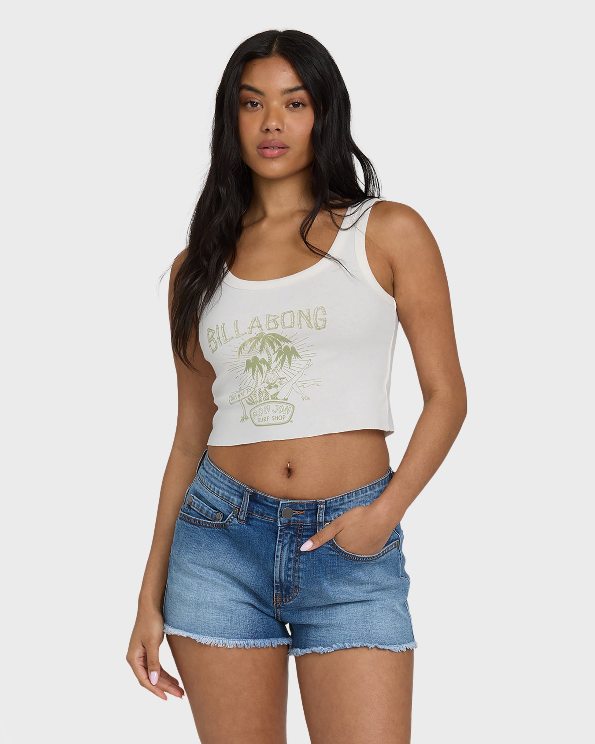 Our Hula Club Ron Jon Tank: Cropped 1X1 cotton rib with soft-hand ink print, piece dye and garment wash for vintage style. Snug fit, scoop neck.