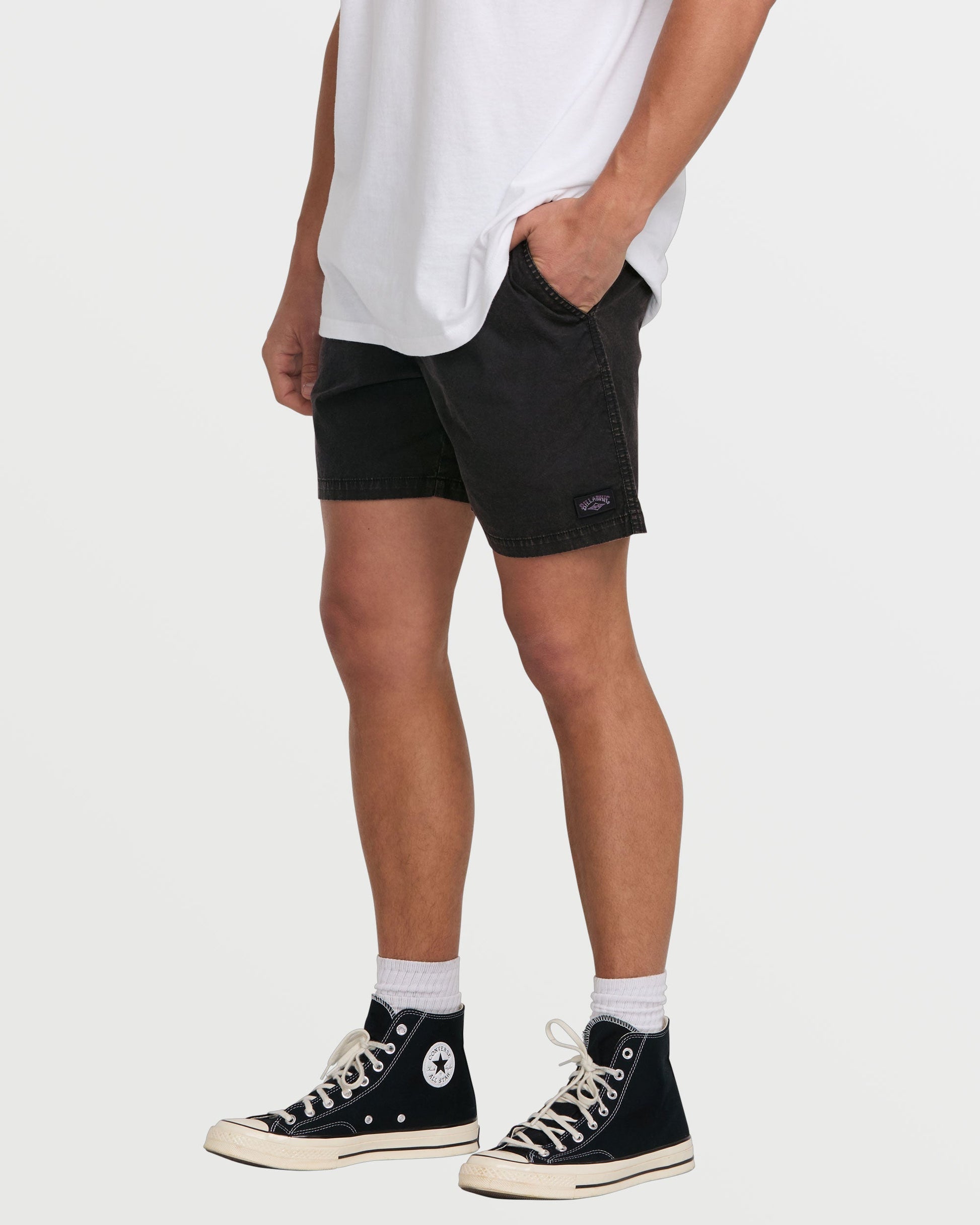 Sun-faded style defines these stretchy Billabong cotton shorts. Made for breezy days, they feature an adjustable elastic waist, roomy pockets, and a signature logo patch. The acid wash adds vintage flair to the 17" casual length. Featured here in the Black colorway.