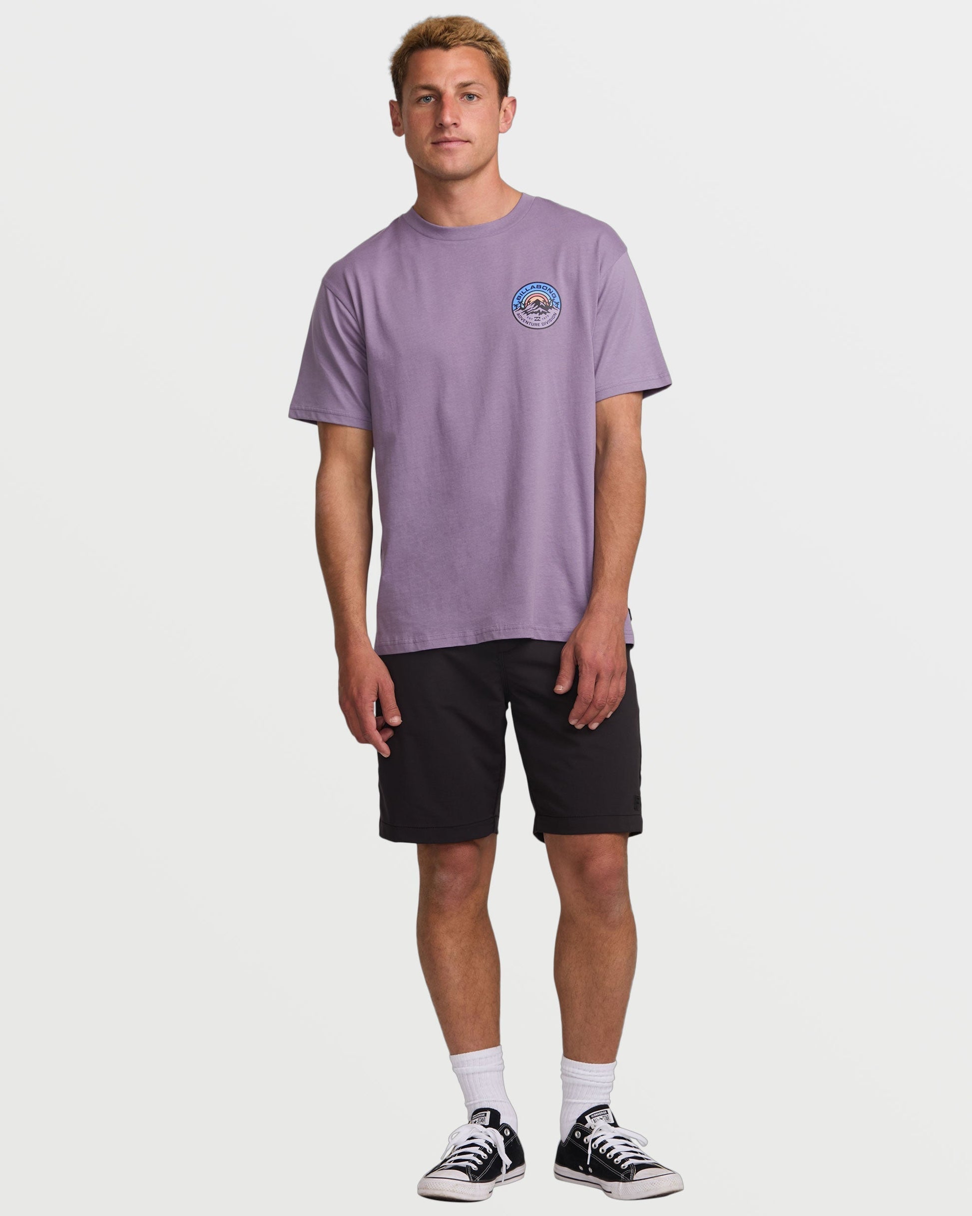 This 100% organic cotton jersey tee brings lightweight comfort and timeless style. Soft screen printed graphics on the front and back add modern flair, while a garment-washed finish delivers a perfectly lived-in feel from day one. Effortlessly stylish. Featured here in the Lavender colorway.