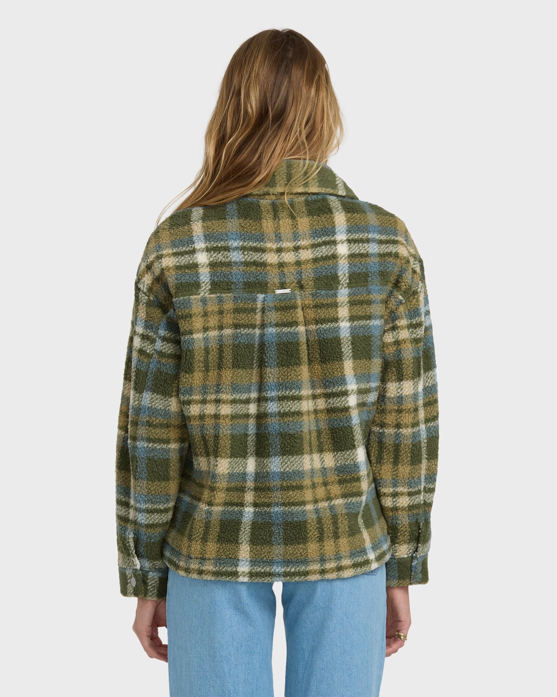 Our cozy sherpa shacket brings practical style with its oversized silhouette and all-over print. Multiple pockets and button details make this piece as functional as it is fashionable for your everyday adventures. Featured here in the Green colorway.